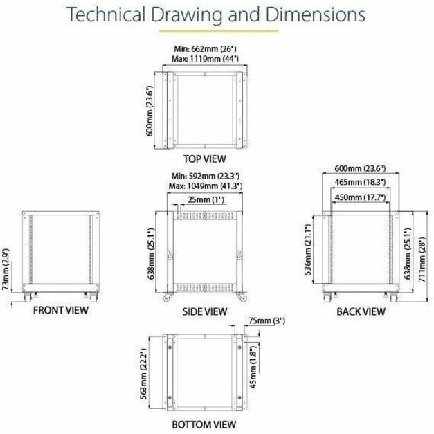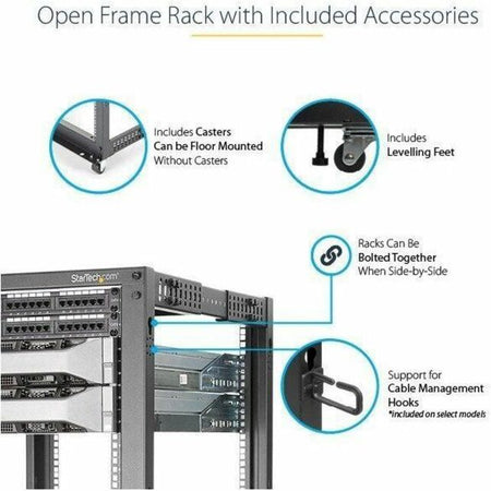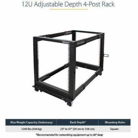 StarTech.com 4-Post 12U Mobile Open Frame Server Rack, 19" Network Rack with Casters, Rolling Rack for Computer/AV/Data/IT Equipment