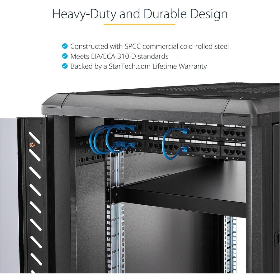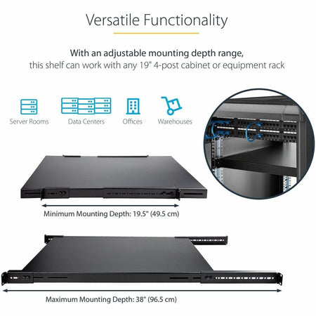 StarTech.com 1U 4-Post 19.5 to 38in Adjustable Mounting Depth Rack Mount Shelf - Heavy Duty Fixed Rack Shelf - 330 lb / 150kg - 27.5in Deep - ADJSHELFHD
