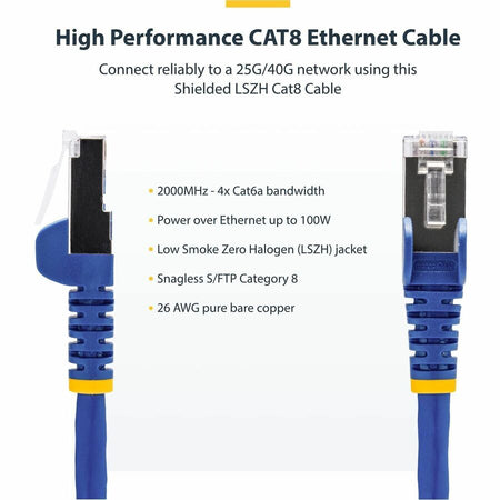 StarTech.com 10ft Blue CAT8 Ethernet Cable, Snagless RJ45, 25G/40G 2000MHz, 100W PoE, S/FTP, 26AWG Pure Bare Copper, LSZH Network Patch Cord - NLBL-10F-CAT8-PATCH