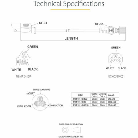 - First End Connector Detail: 1 x 3-pin NEMA 5-15P Male