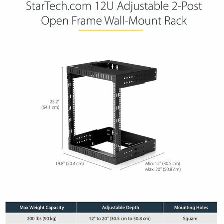 StarTech.com 2-Post 12U Heavy-Duty Wall Mount Network Rack, 19" Open Frame Server Rack with Adjustable Depth, Data Rack for IT Equipment~