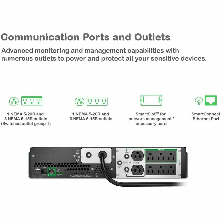 APC Smart-UPS, Line Interactive, 2200VA, Lithium-ion, Rackmount 2U, 120V, 2x NEMA 5-20R+6x NEMA 5-15R outlets, SmartConnect Port+SmartSlot, AVR, LCD