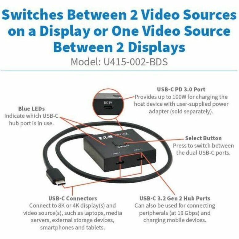 Eaton Tripp Lite Series 2x1 Bi-Directional USB-C Switch - 8K 60 Hz Video, HDCP Passthrough, USB 3.2 Gen 2, 100W PD Charging, Black - U415-002-BDS