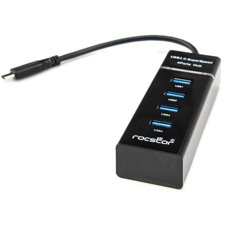 Rocstor Premium Slim Portable 4 Port Hub - USB-C to 4x USB-A Slim Hub - USB 3.0 Hub - Bus Powered - Black - USB C to USB Type-A Hub - USB Type C - External - USB-C 3.1 to 4 USB Type-A 3.0 Port(s) USB-A
